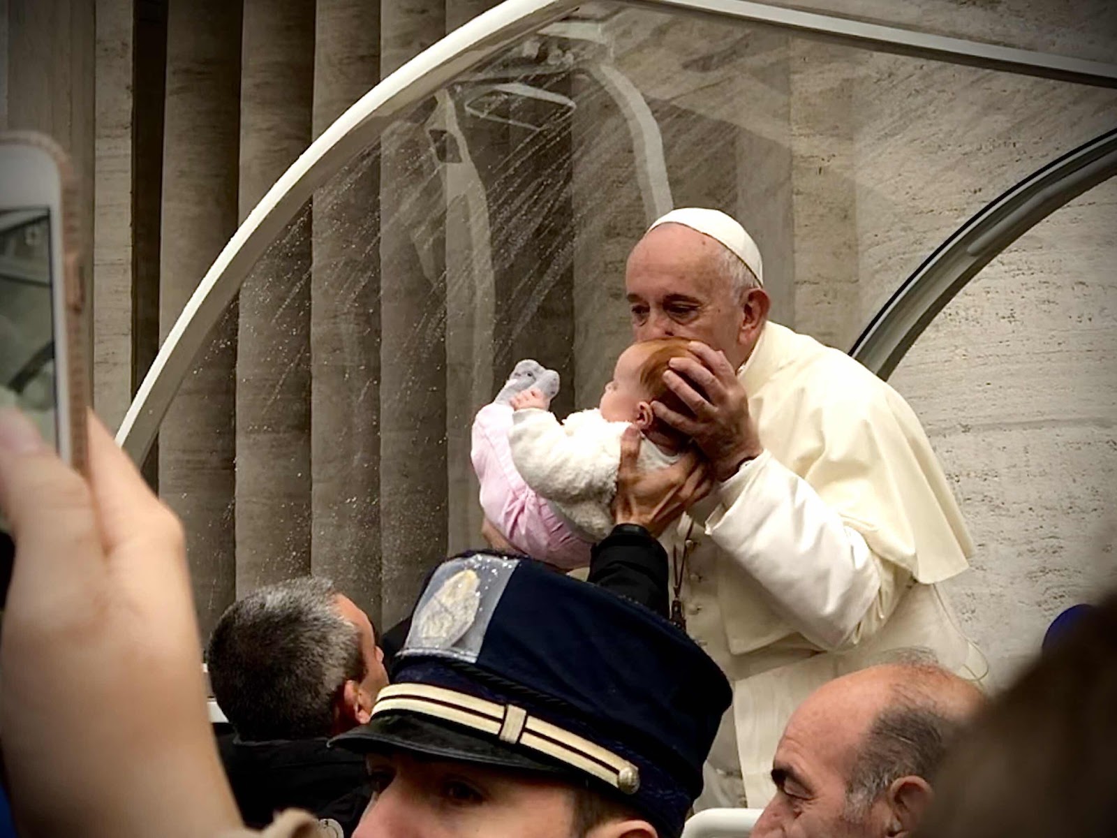Clare slept in her stroller - with the rain cover - until Pope Francis emerged in the car around 9:30 am. I then carried her to the railing between several students (I didn't want to hand her off, fearful that she would start crying). Students hollered and cheered as Pope Francis approached, better quickly it seemed, his car slowed and one of the guards got the signal that he could pick up Clare. Pope Francis blessed a child on his right side first, and we all waited as the guard held Clare, then he turned to his left side (our side) and kissed Clare!